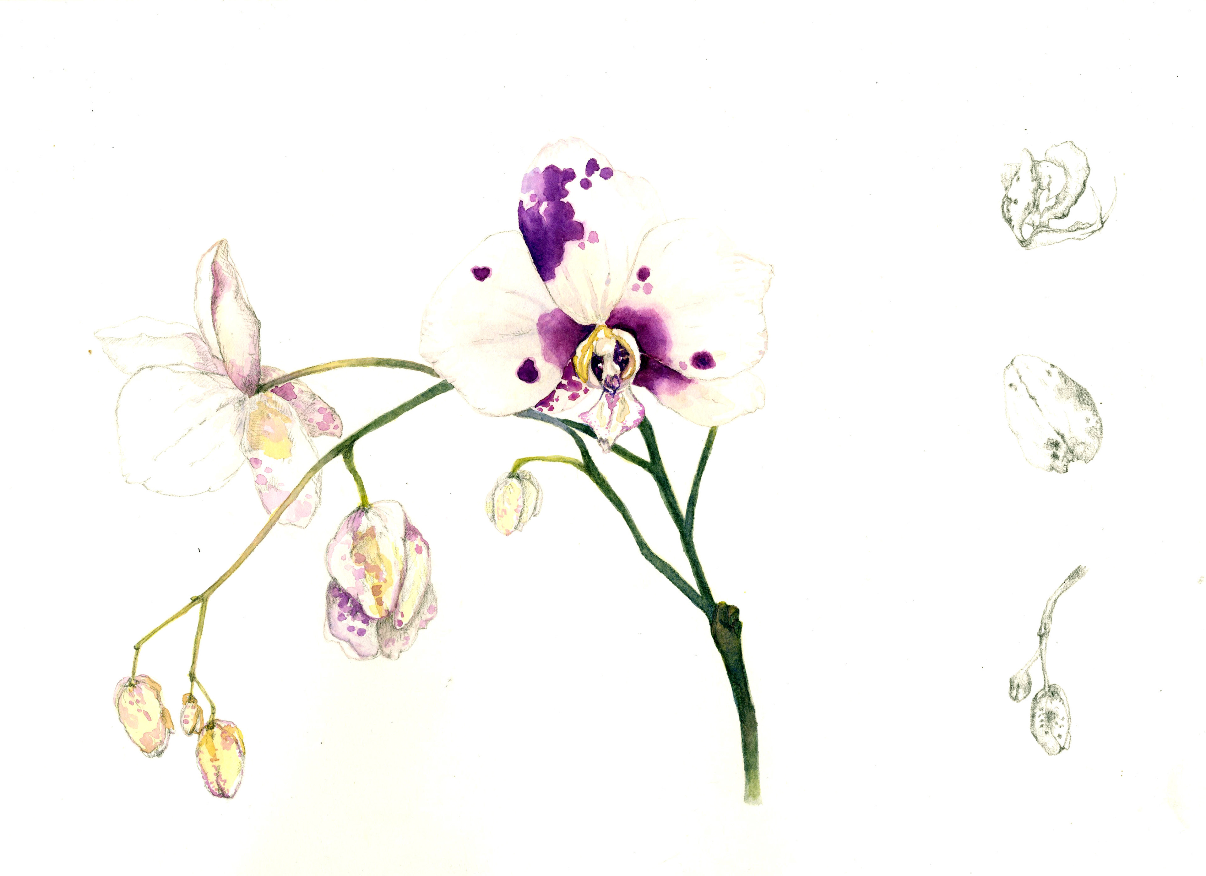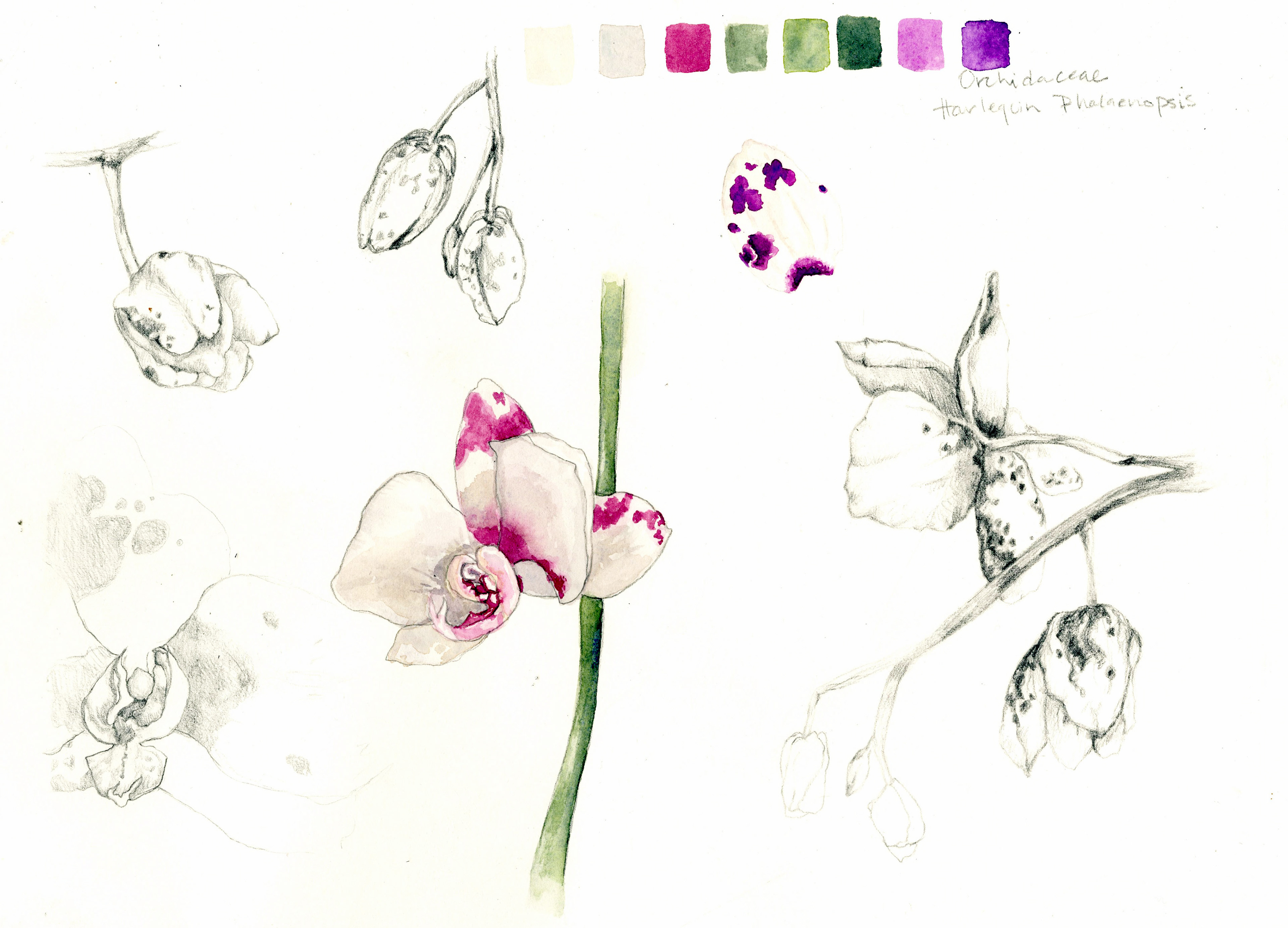 Botanical Illustration Study Sheet of an Orchid with pencil illustrations
