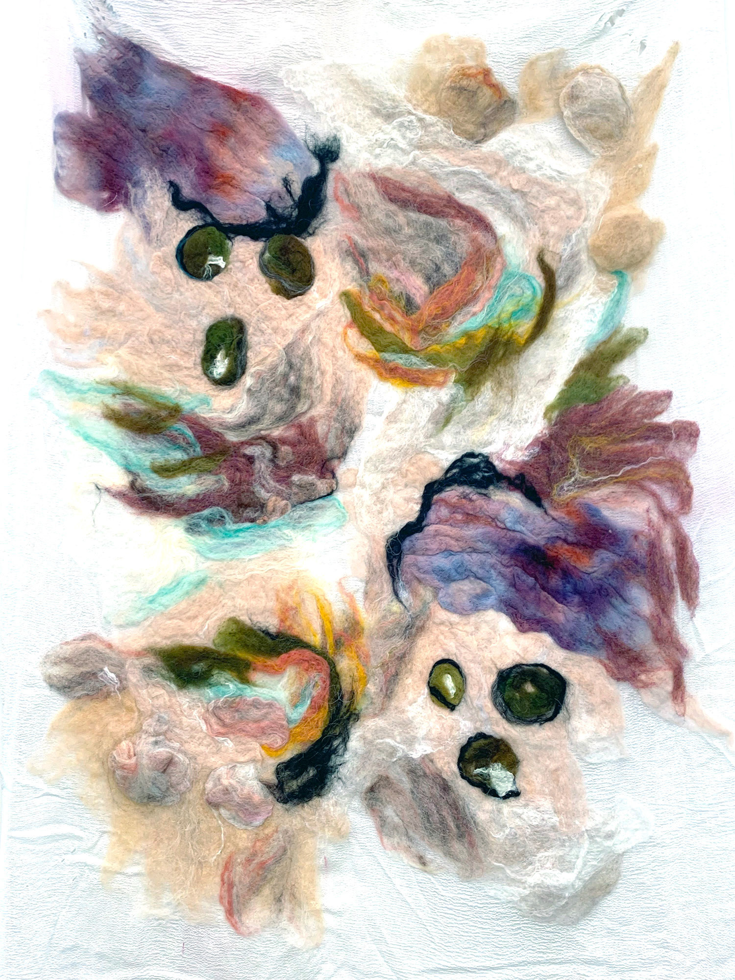 A felted wall hanging. Nuno felted wool on silk gauze.