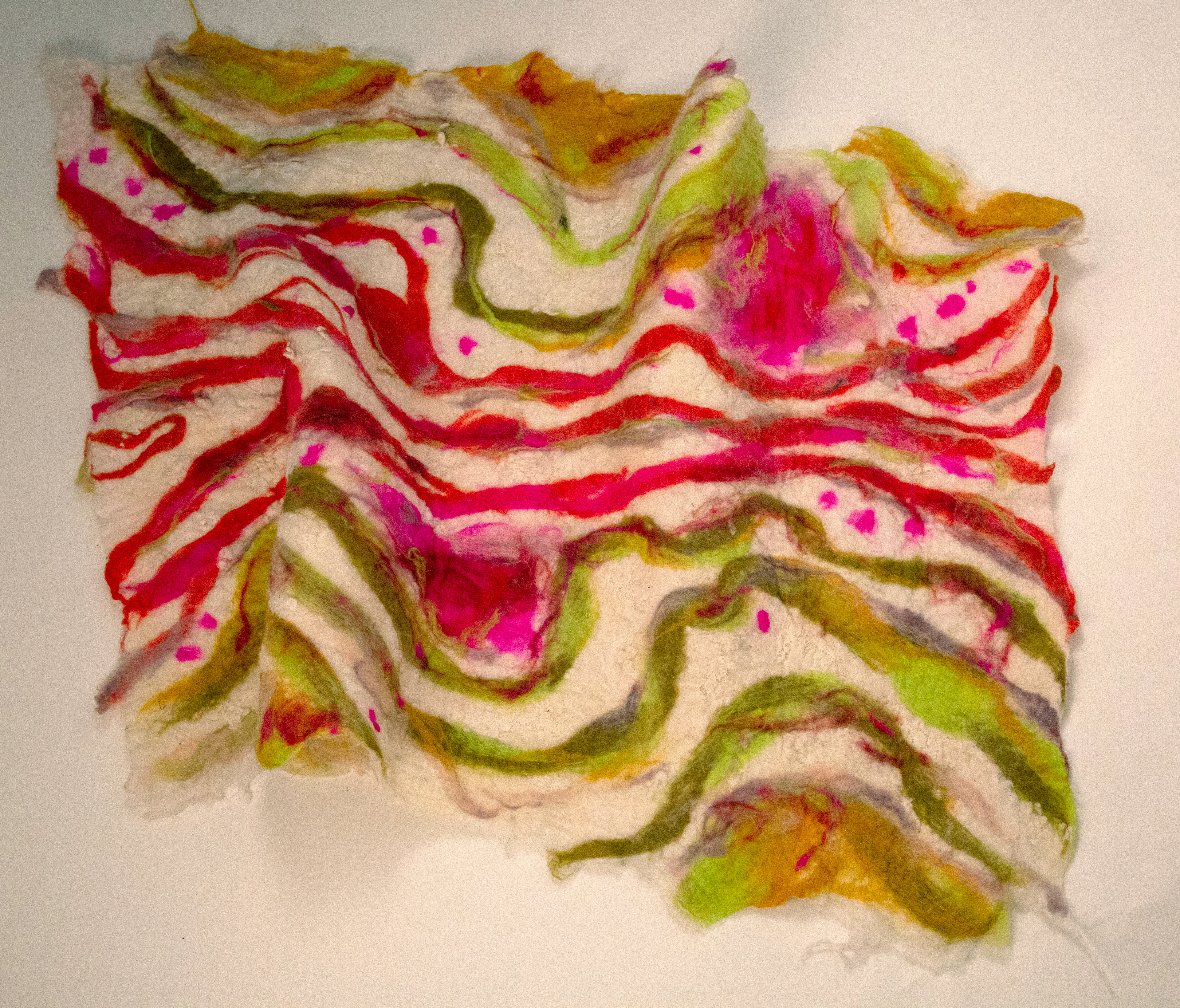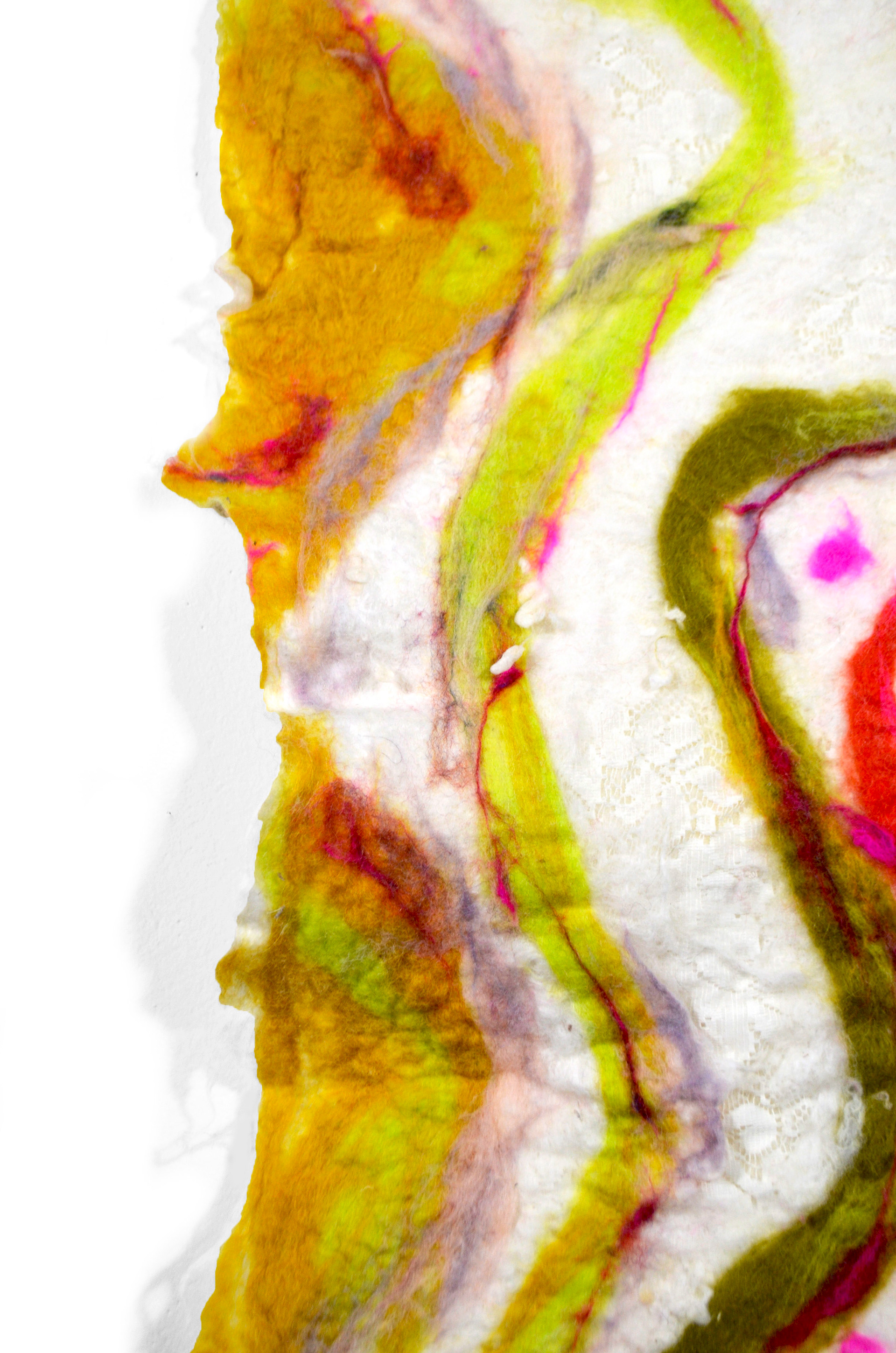 A felted wall hanging, large scale, installation, wall piece. Felted wool. Materials: lace, wool, alpaca fiber