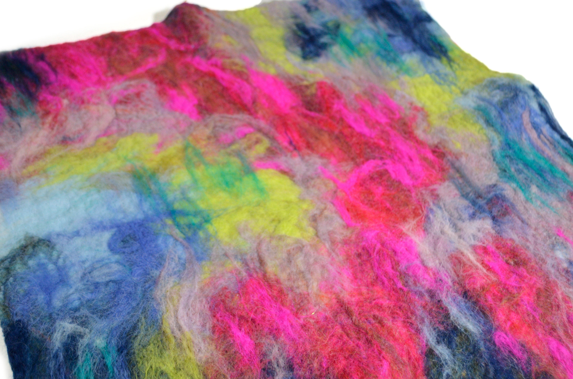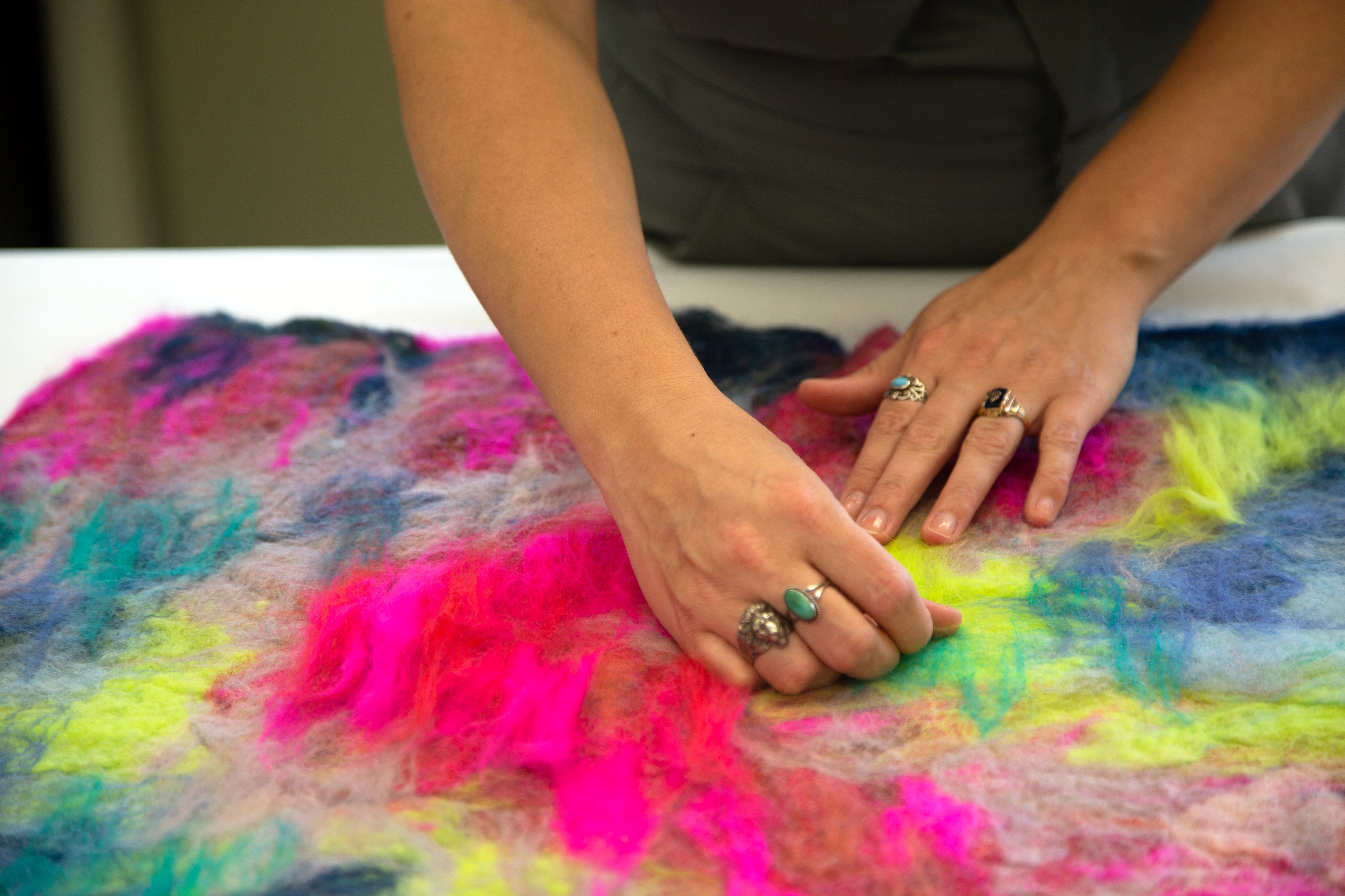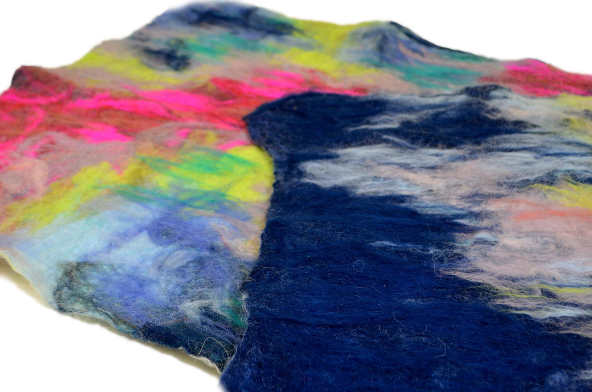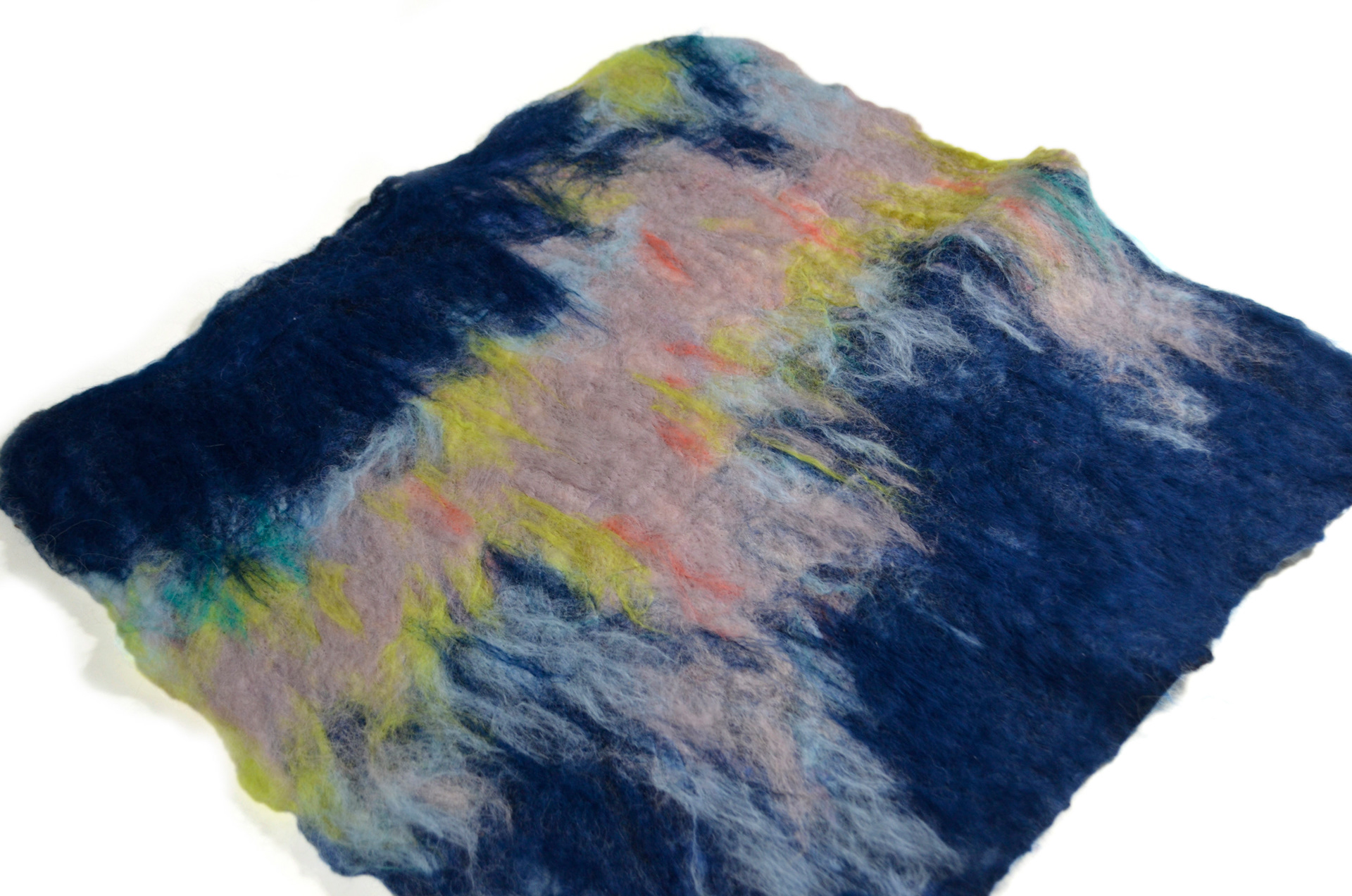 Two felted works. Each piece has been made through the felting process, a labor of love. Made of wool and backed with wool gauze, these works could be displayed within a frame on a wall or by themselves.