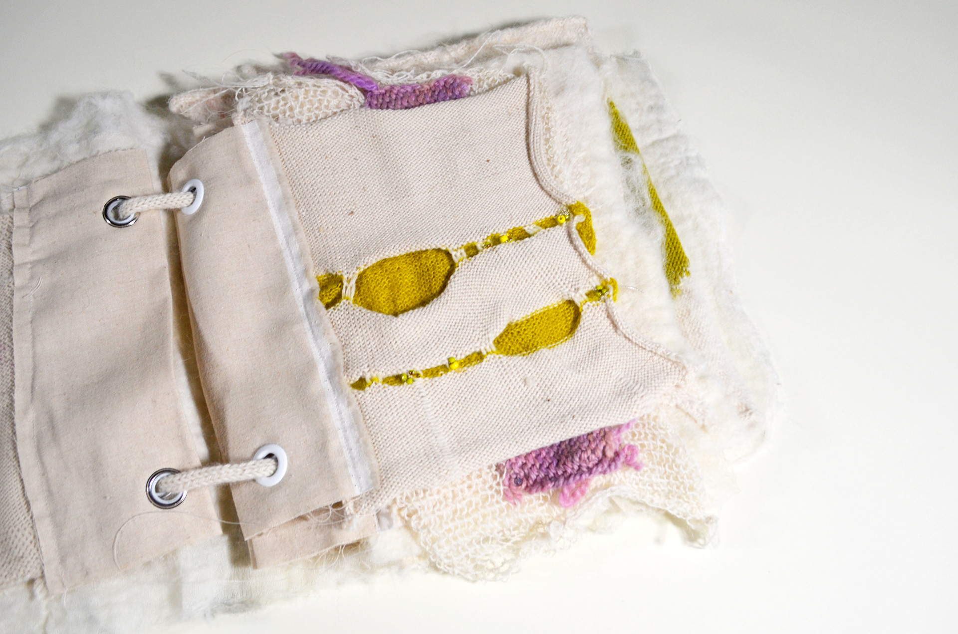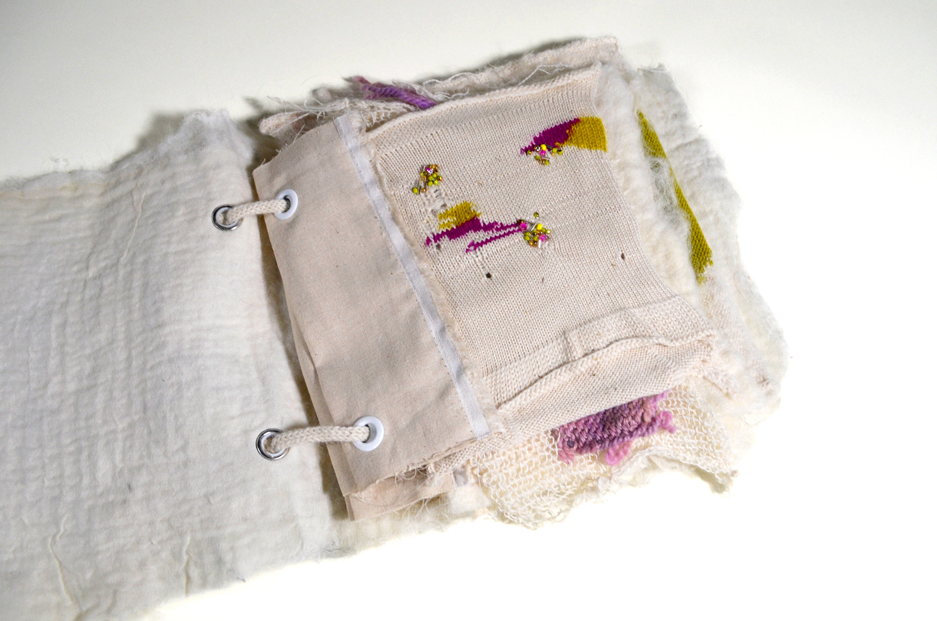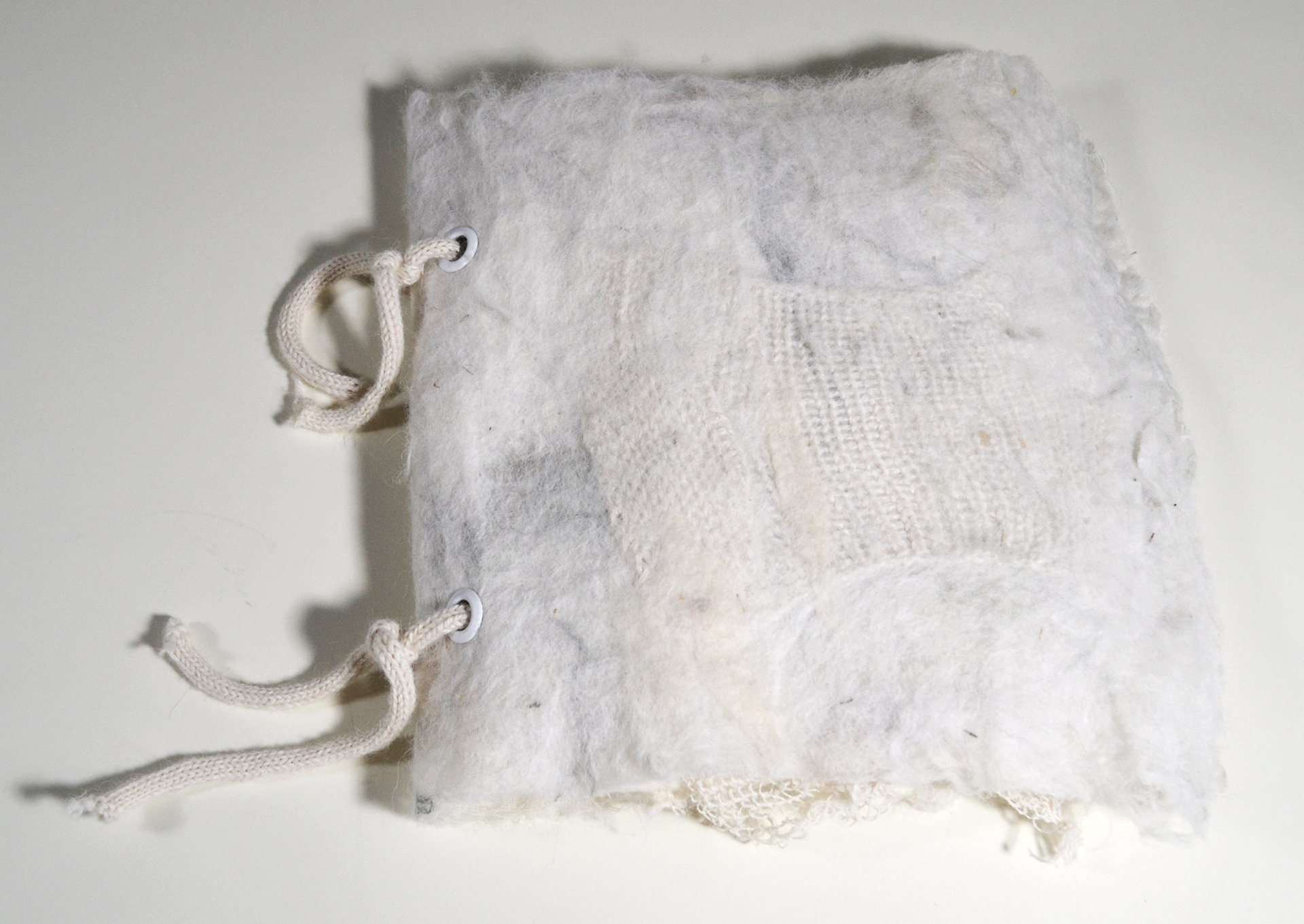 Machine knit sampling. Samples made with multiple techniques, such as lifted stitches, intarsia, ladders and pointelles. Samples also have beading and felting techniques added. Book is handmade that houses the textile designs.