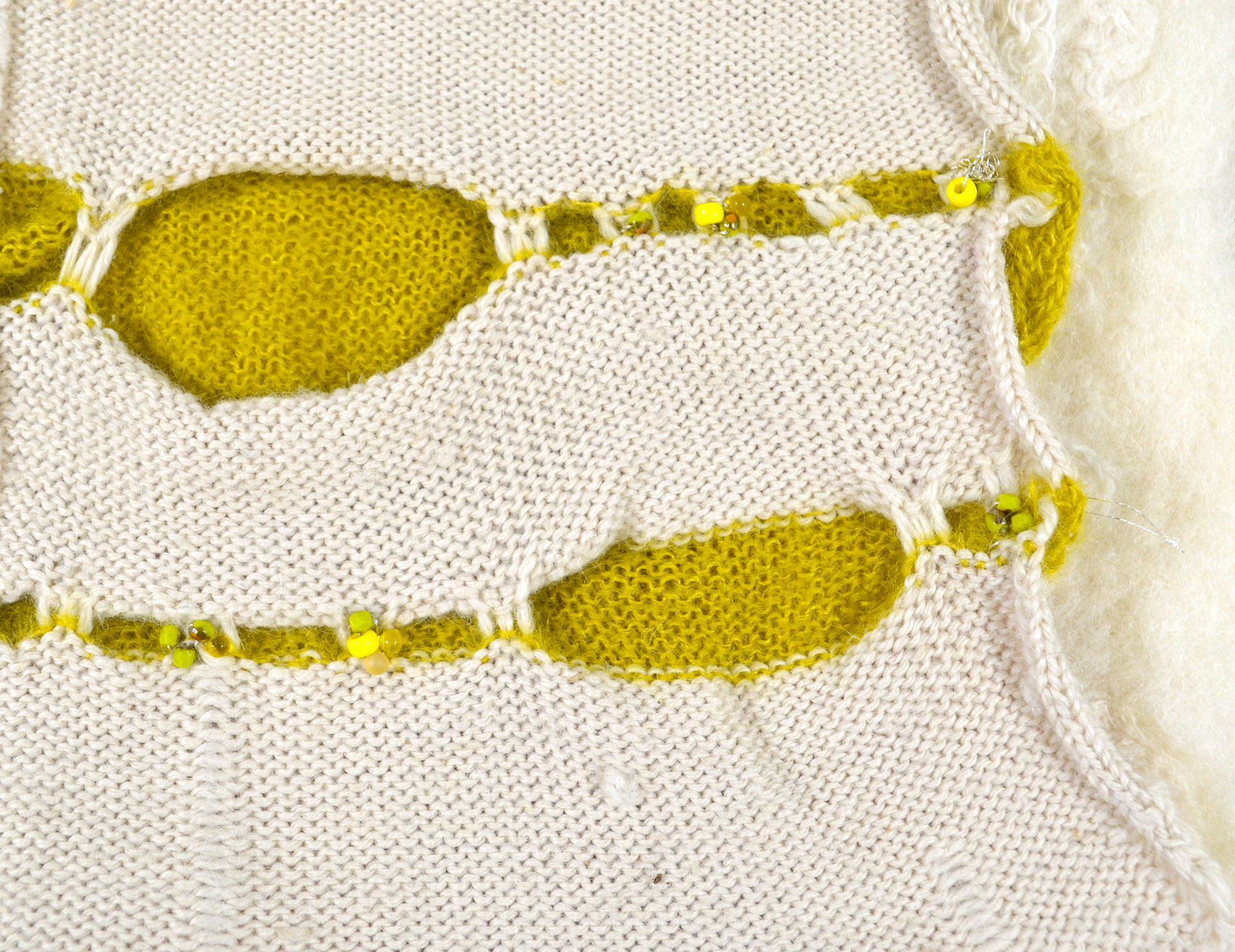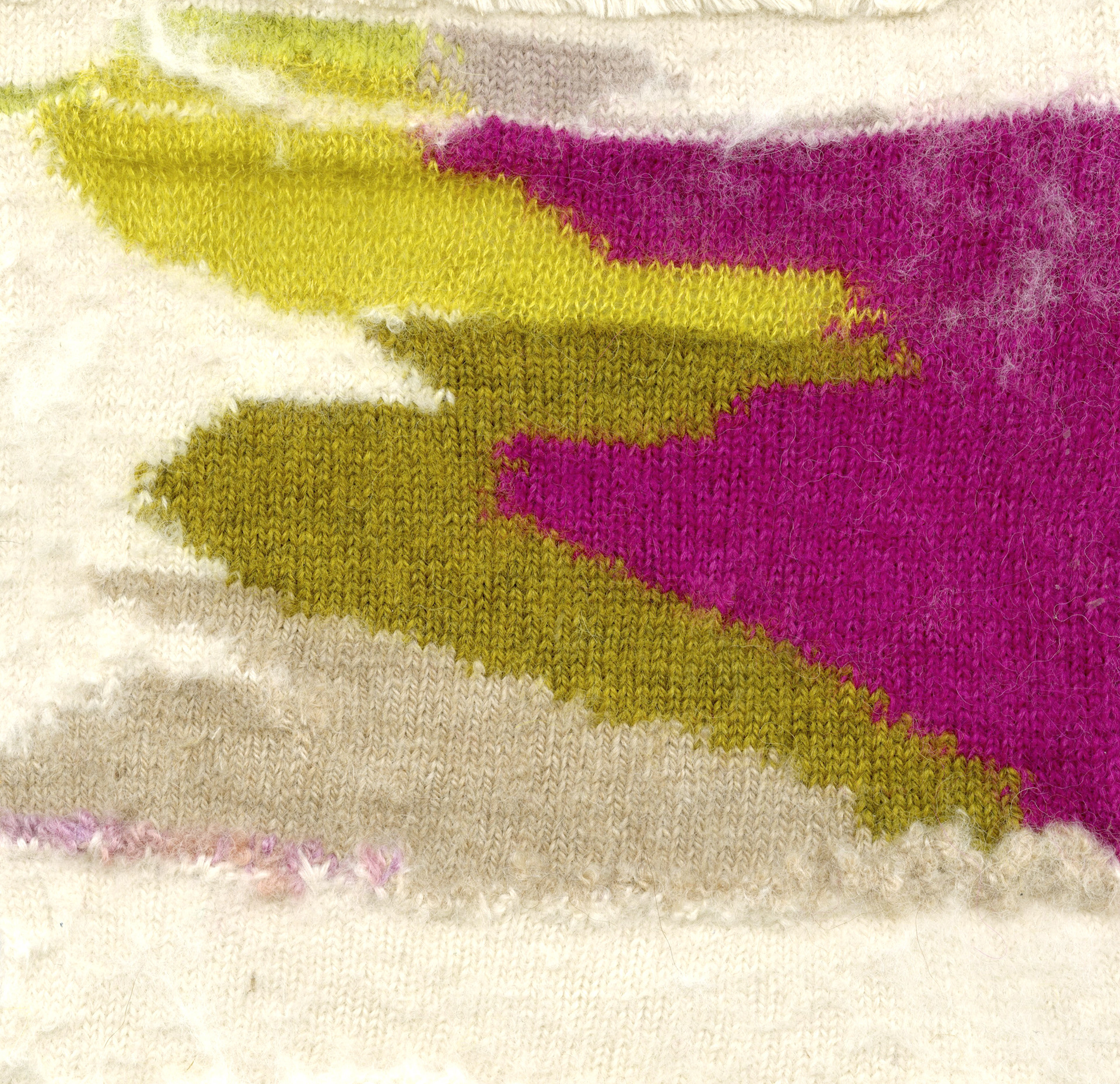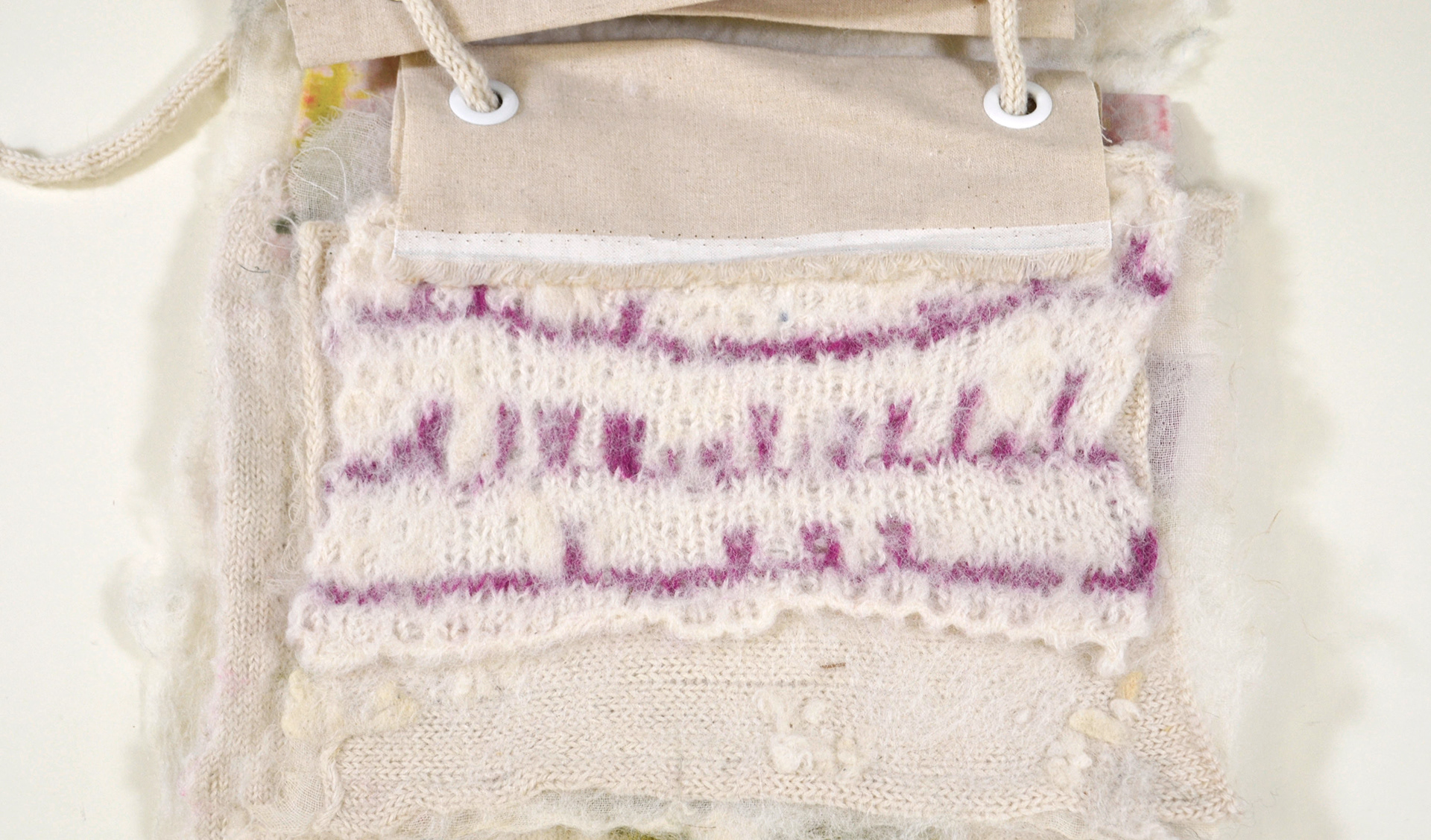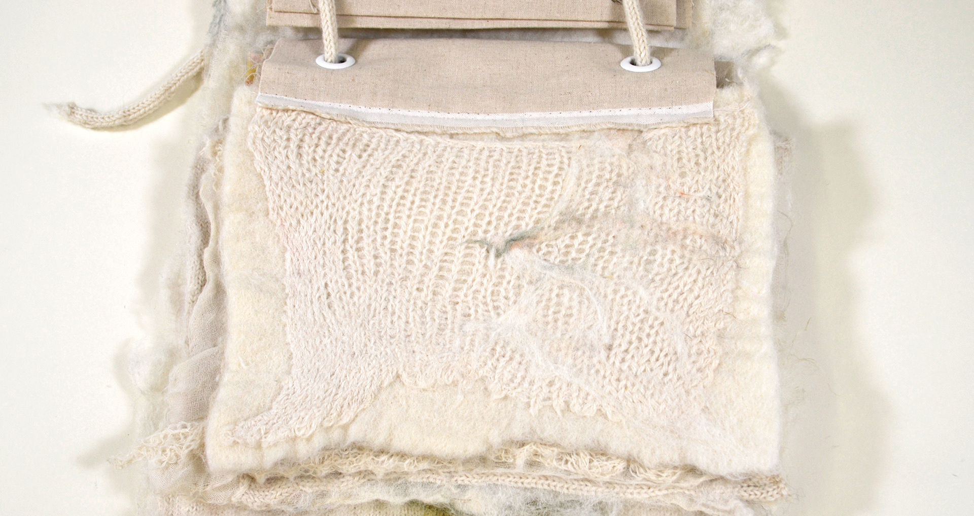 Machine knit sampling. Samples made with multiple techniques, such as lifted stitches, intarsia, ladders and pointelles. Samples also have beading and felting techniques added. Book is handmade that houses the textile designs.