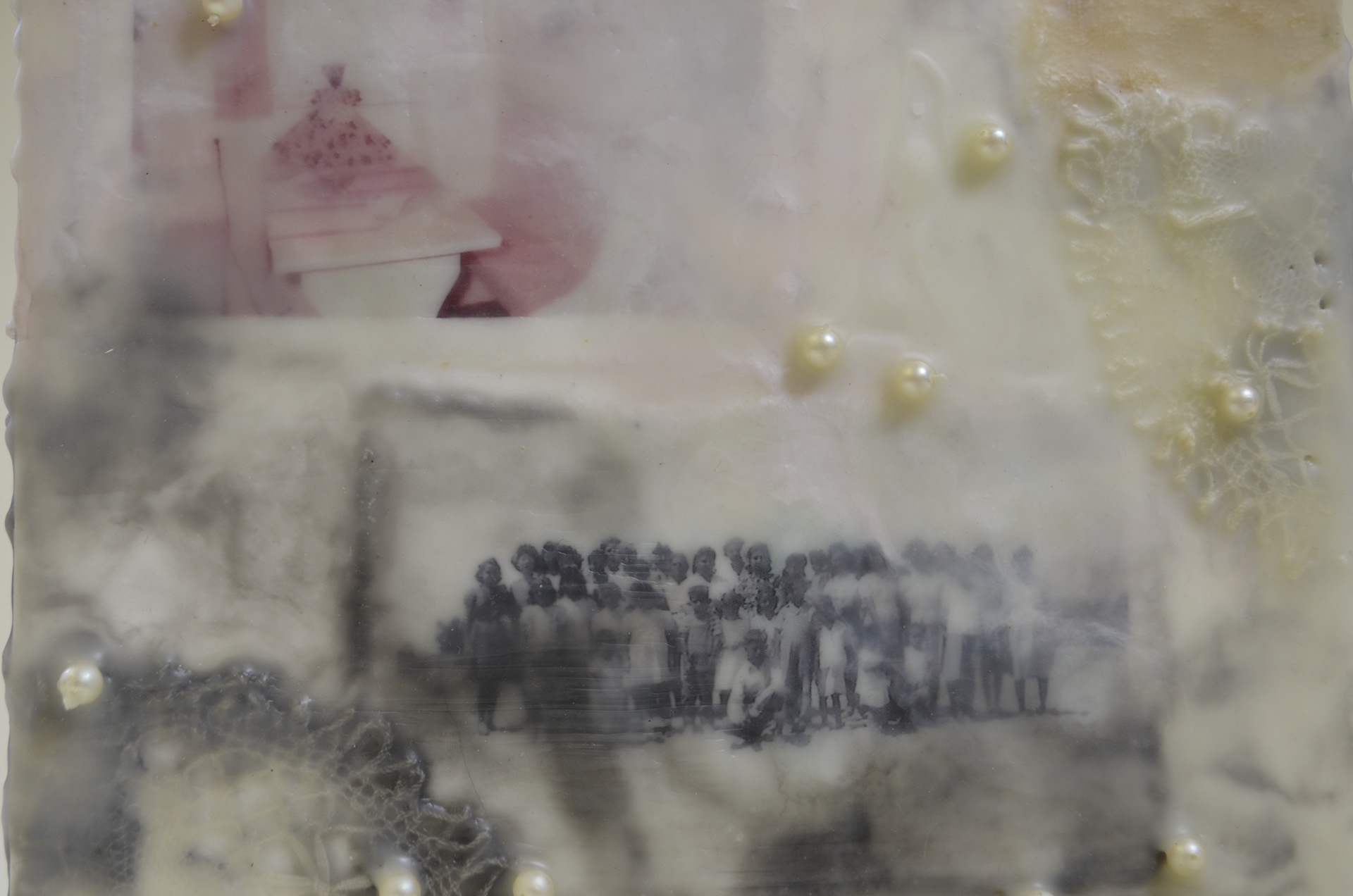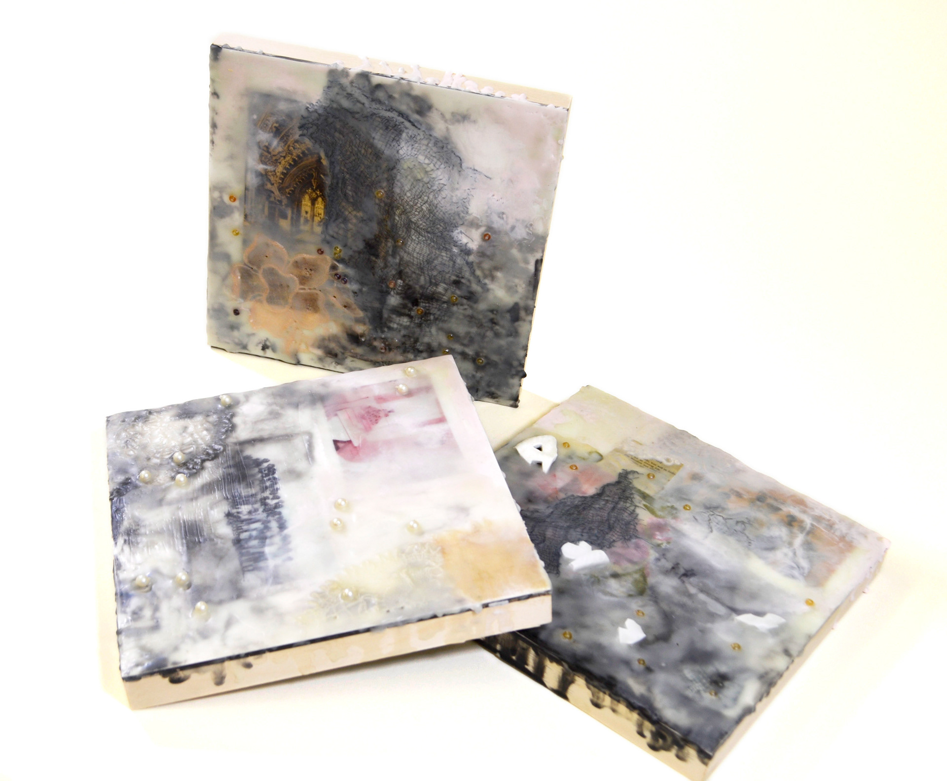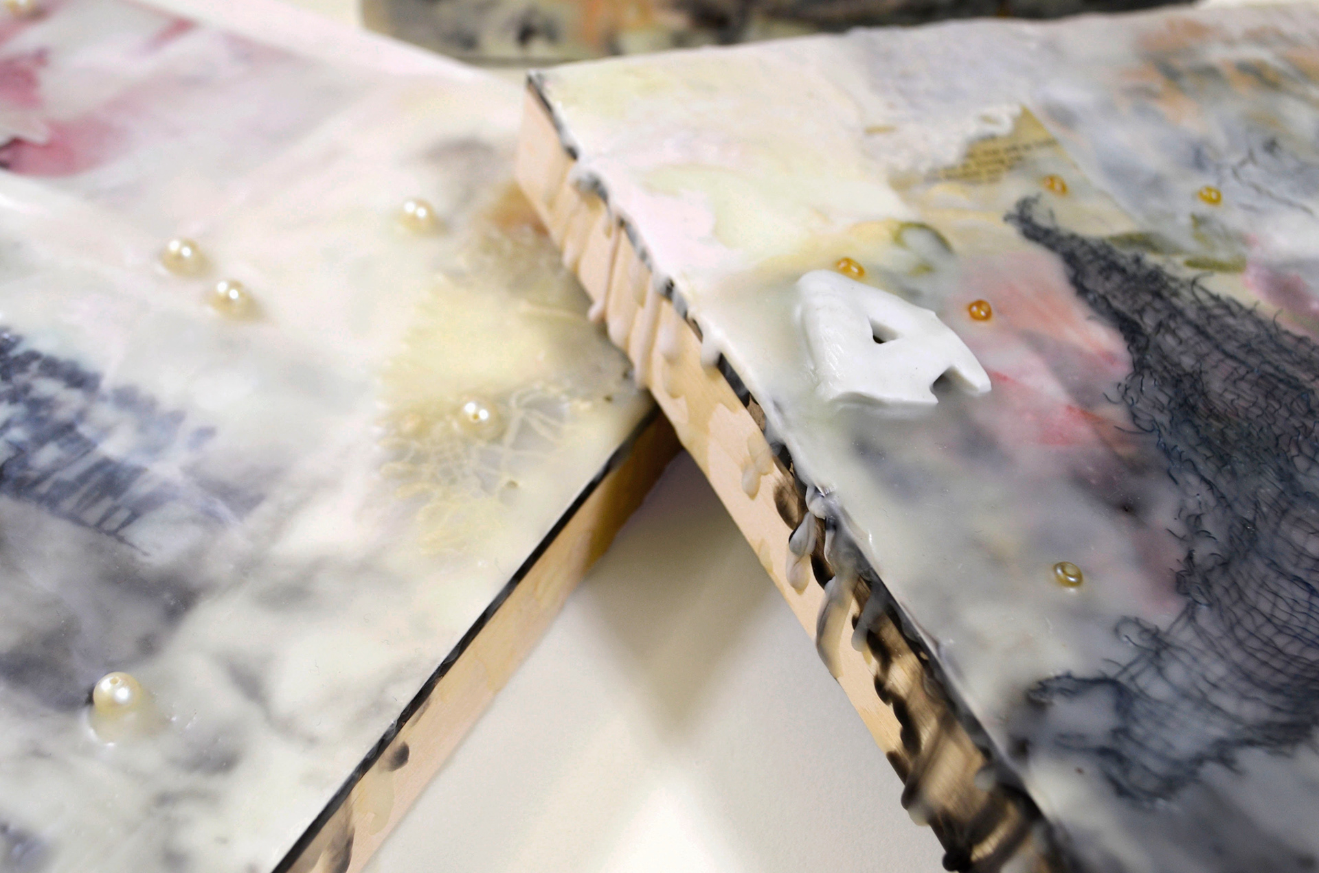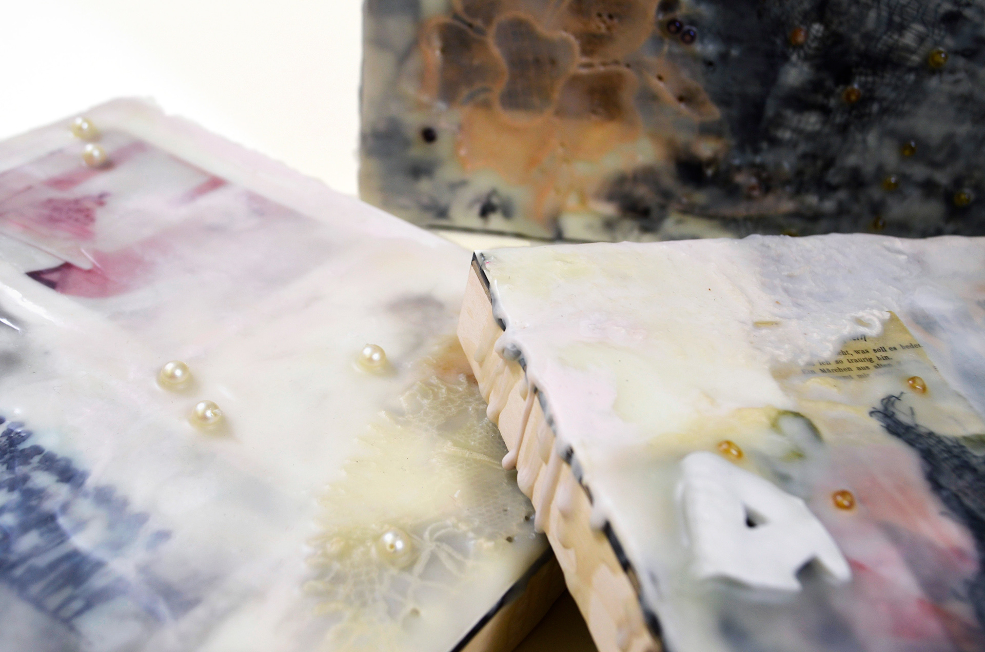 Panel covered in wax and resin. Mixed media paintings including fabric, pearls, postcards, beads and photos printed on fabric.