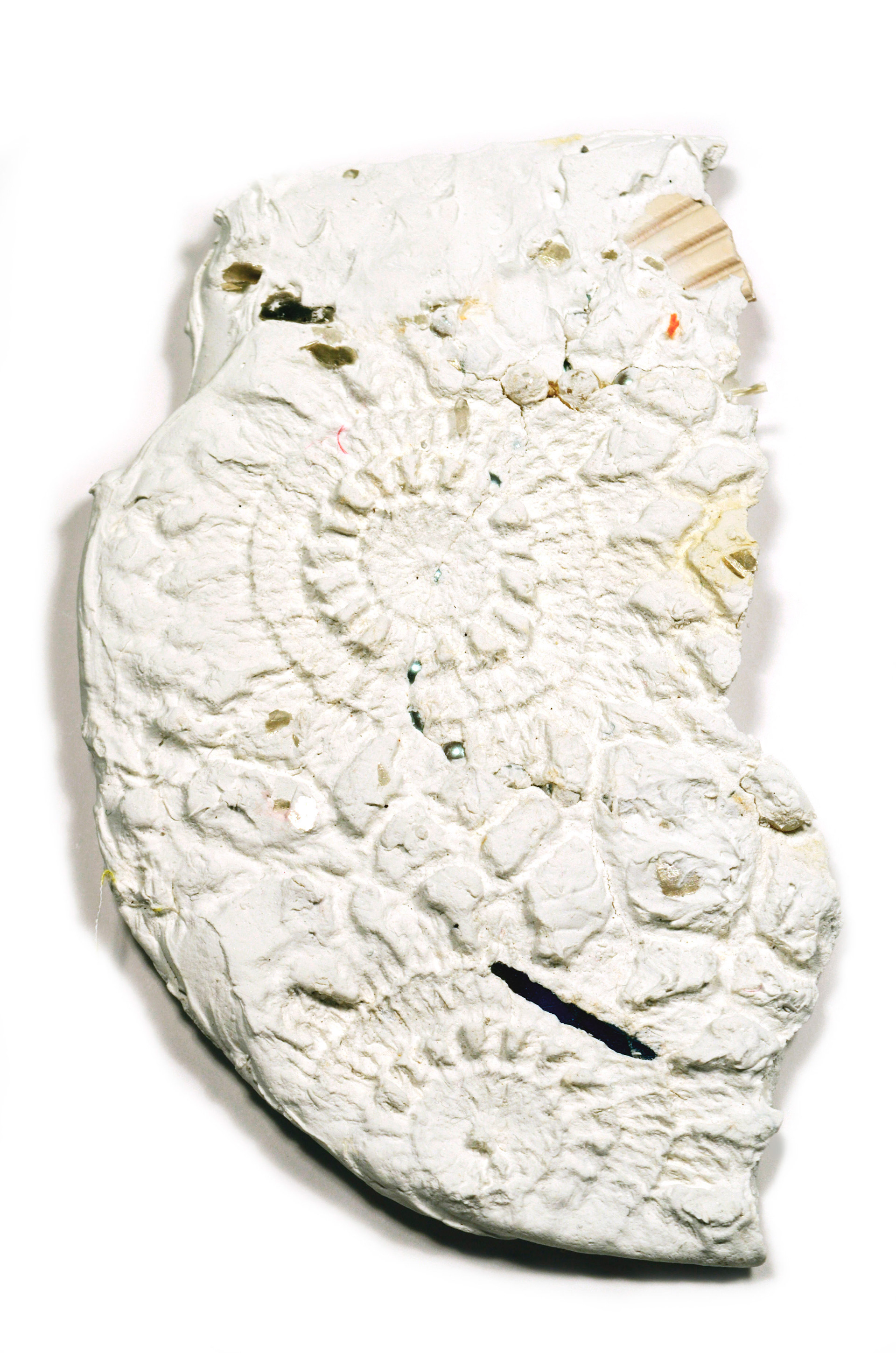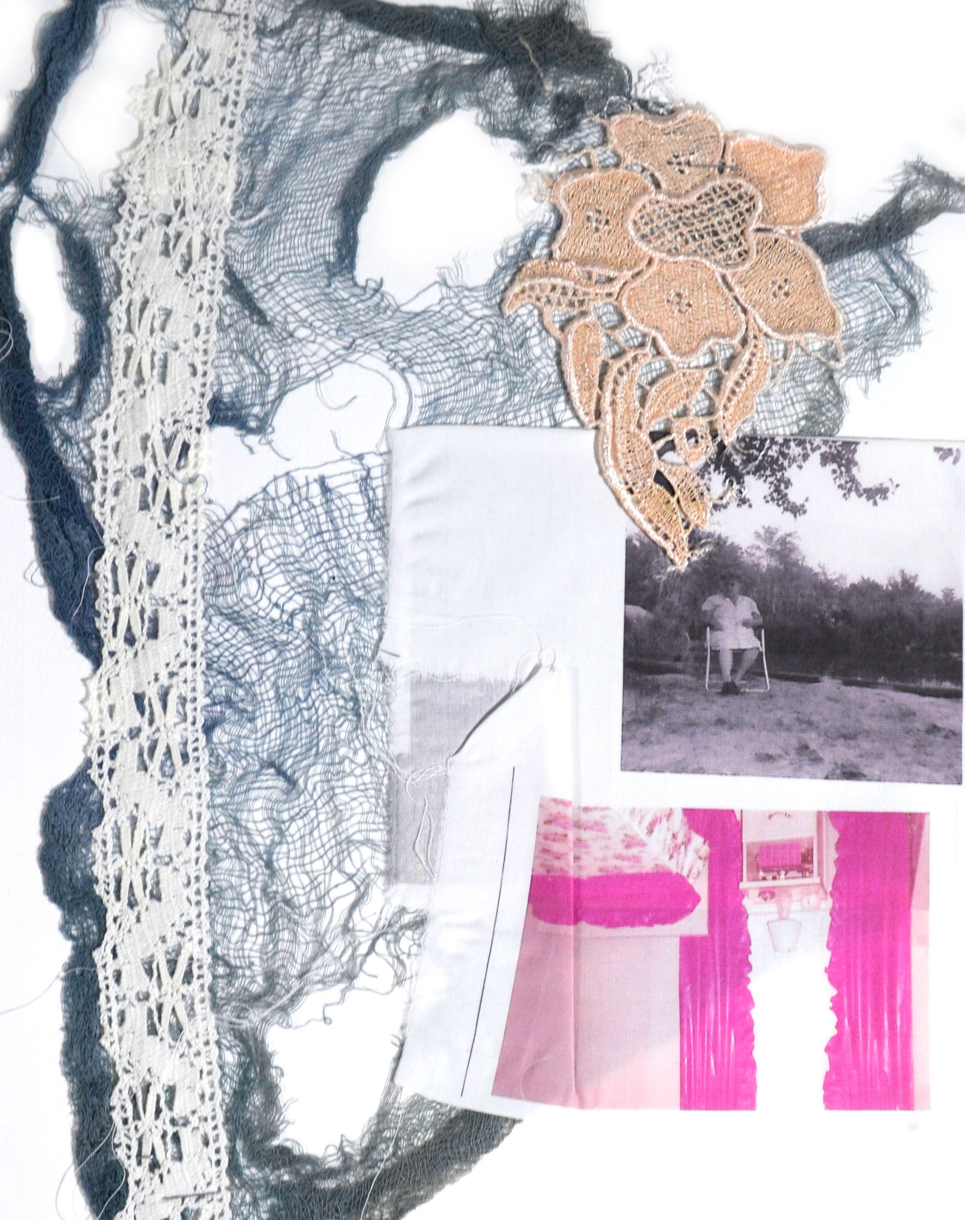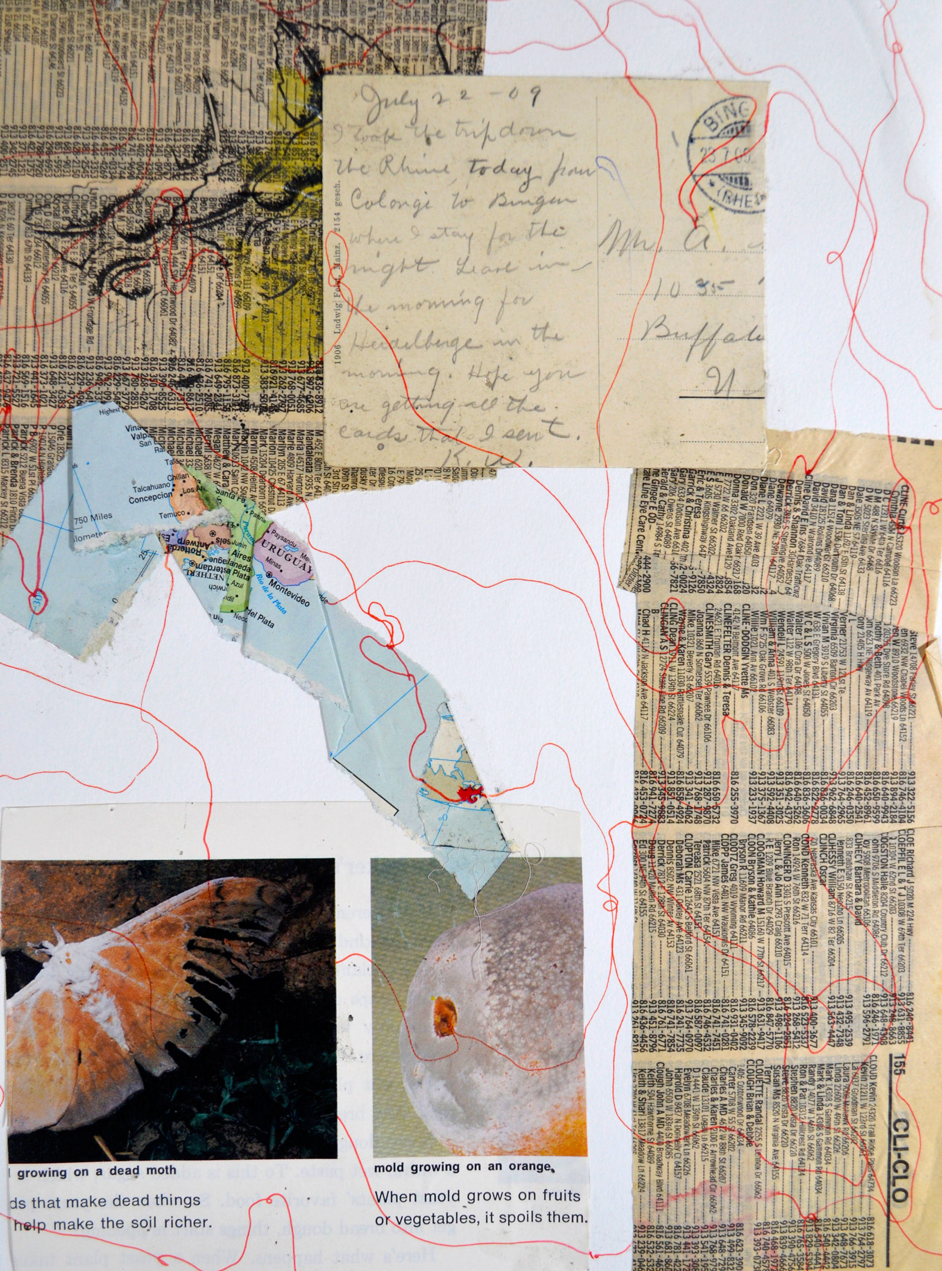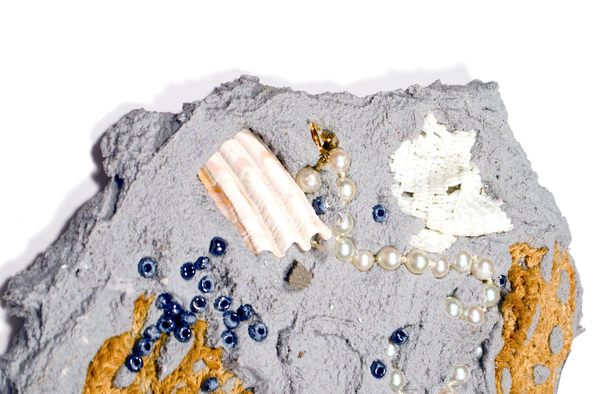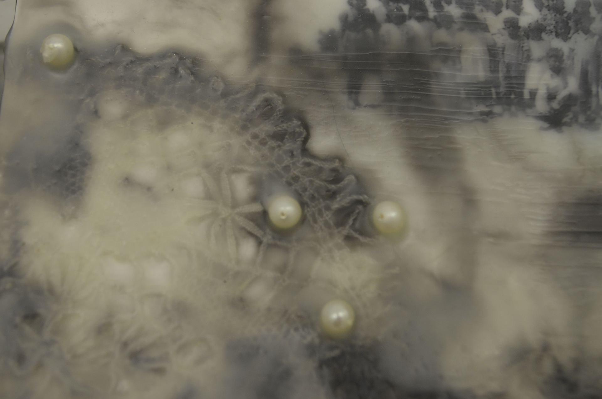 Panel covered in wax and resin. Mixed media paintings including fabric, pearls, postcards, beads and photos printed on fabric.